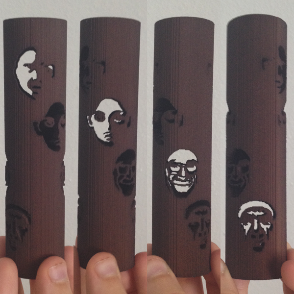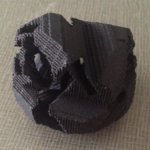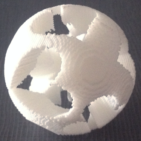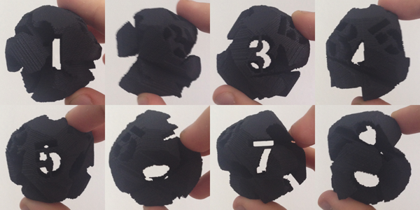Every time a new image is cut out of the form, it increases the risk that part of the adjacent images will become less visible. As such, I have attempted to alleviate the problem by alternating between exterior and interior images. For example, for numbers 1-8, I cut away the even numbers in usual way, but had the odd numbers hollowed-out through the image. For the printed version of these, the main problem was the support structure (during the 3D printing process, a support structure has to be created around and inside the form). This support structure has to be cleared out in order to see through the hollowed-out shapes. Due to the small scale of the prints I've created, clearing out the support structure is difficult because of the size of the openings.