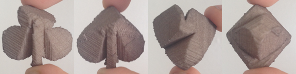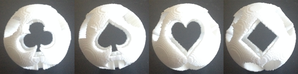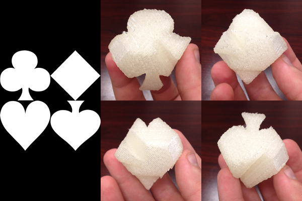The exciting part about this process is that it allows for easy creation of 3D objects with 2D properties (meaning that, if viewed from a specific angle, the object will appear to resemble a specific shape). One experiment in the robustness of this process sought to create an object that could represent the four playing card suits. While some clipping did occur (most notably on the Heart), the results are promising.